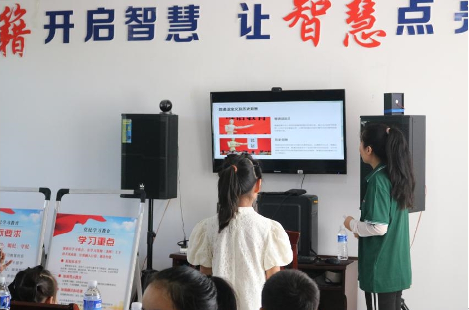 实践团队走进当地学校,为小学生讲授了普通话课程,组织学生开展经典诵读,并通过“词语接龙”“你说我猜”等趣味活动锻炼小学生的语言组织能力和表达能力。