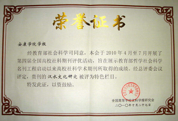 日前,全国高等学校文科学报研究会六届二次理事会暨2010学术年会在重庆西南大学举行。会上公布了第四届全国高校社科学报评优活动结果,我院学报“汉水文化研究”栏目被评为“特色栏目”。这是该栏目继全国地方高校学报“特色栏目”和陕西省高等学校学报“特色栏目”之后获得的又一奖项。此次评优活动是在各省新闻出版局与各省高校学报研究会评优结果的基础上进行的,我省共推荐19个特色栏目参加全国评比,9家获奖,我院学报位列其中。