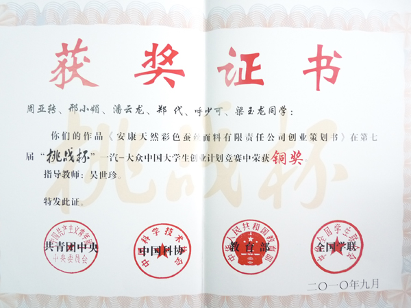9月25日至29日,由共青团中央、中国科协、教育部、全国学联共同主办的第七届“挑战杯”中国大学生创业计划竞赛决赛,在吉林大学隆重举行。团中央书记处书记卢雍政,吉林大学校长展涛,长春市委常委、常务副市长隋忠诚代表竞赛主承办单位在开幕式上致词。全国学联主席齐兴达同学、吉林大学党委书记陈德文以及教育部、中国科协、中共吉林省委有关负责同志出席了开幕式。KY开元集团官网天彩创业团队的《安康天然彩色蚕丝面料有限责任公司》创业计划书参加了本次赛事的角逐,并最终获得铜奖。