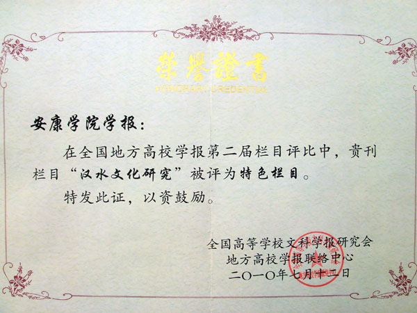 经全国地方高校学报研究会评定,我院学报的“汉水文化研究”栏目被评为“特色栏目”。此次获奖表明我院学报的特色发展之路又上了一个新台阶。 第二届全国地方高校学报栏目评比,共有全国234所地方高校学报会员单位参加,最终评选出18个“名栏”、25个“优秀栏目”、26个“特色栏目”。