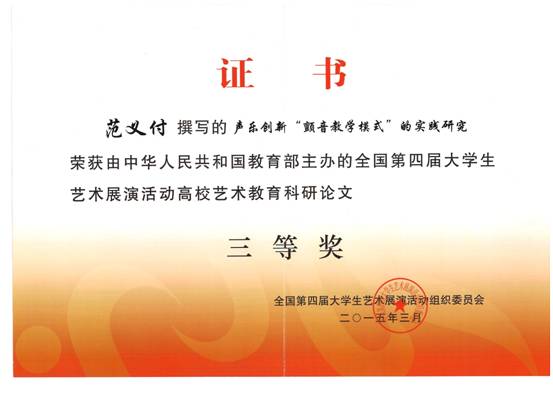 在近日结束的由教育部主办的全国第四届大学生艺术展演活动中,开元官网艺术系学科带头人范义付副教授撰写的《声乐创新“颤音教学模式”的实践研究》荣获高校艺术教育科研论文三等奖,这是范义付副教授自2009年后再次获得此项奖励。该论文是开元官网教研立项项目成果,它的获奖也标志着开元官网声乐教学研究达到国内较高水平。