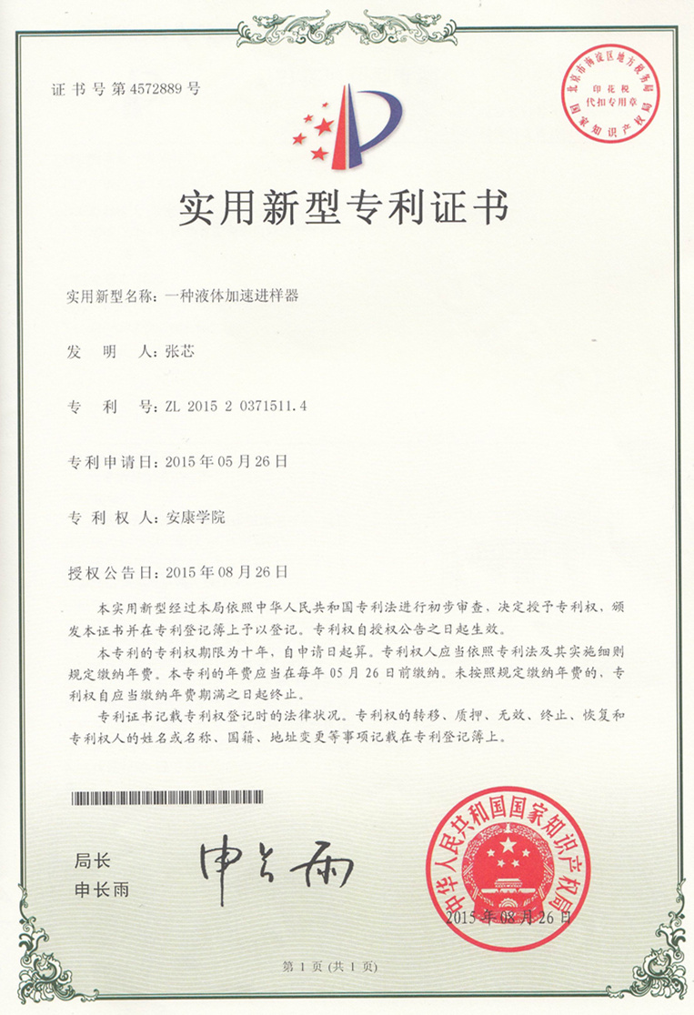 日前,以KY开元集团官网作为专利权人,化学化工系教师张芯作为第一发明人申请的实用新型专利“一种微型全自动中空纤维膜测试平台”、“一种液体加速进样器”,相继获得国家知识产权局授权,并获得专利证书,专利号分别为ZL 2014 2 0865489.4和ZL 2015 2 0371511.4。