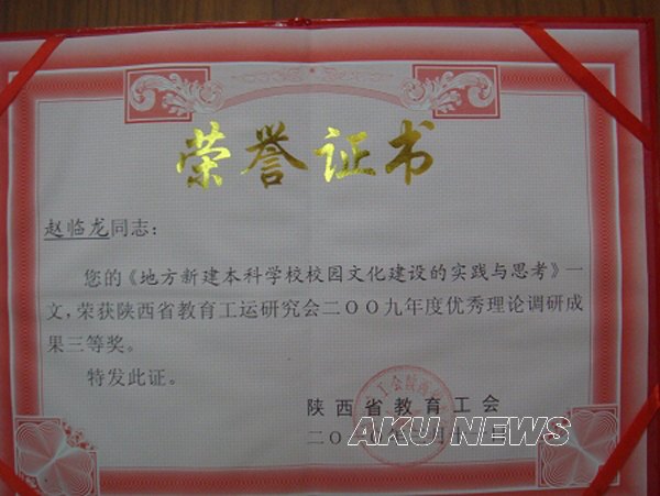 我院数学系主任、教授、院工会兼职副主席赵临龙同志的《地方新建本科学校校园文化建设的实践与思考》一文,在3月12日结束的陕西省教育工会“2009年度教育工运理论研究年会” 上,被评为三等奖。