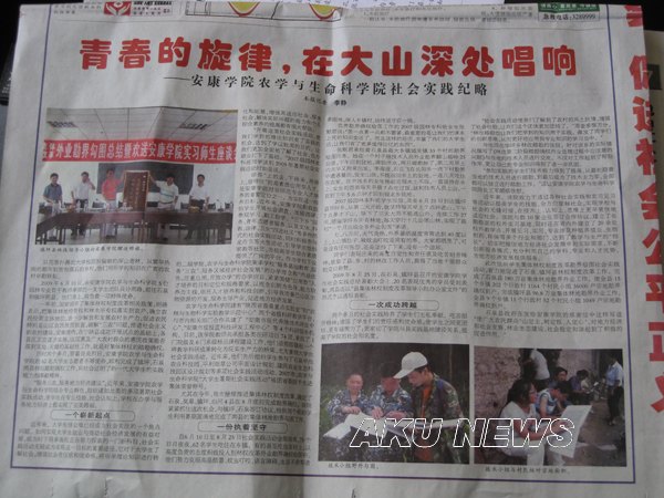 以政史系学生为主的我院“建国60周年成就调研义务宣讲社会实践服务队”制作图片展板、文字宣传资料在假期前往安康市各县区,开展形势政策义务宣讲活动,把先进的文化传播到了基层,开阔了基层群众的视野,丰富了基层群众的历史知识,增强了人民群众的民族自豪感和荣誉感,激发了人们的爱国意识,具有良好的社会影响和社会意义。《安康日报•科教周刊》8月6日进行了报道(电子版:http://sjk.akrb.cn/kjzk/html/2009-08/06/content_22127.htm)爱读爱看网:http://press.idoican.com.cn/detail/articles/20090806185B36/进行了转载。