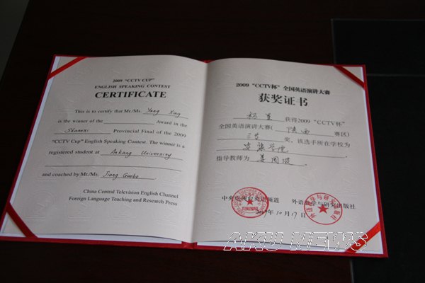 10月17日,我院外语系07级本科英语专业杨星同学,代表我院参加了在长安大学举行的2009“CCTV杯”全国英语演讲大赛(陕西赛区)复赛。经过激烈角逐,杨星同学脱颖而出,荣获三等奖,姜国波老师荣获“优秀指导教师”称号。 2009“CCTV杯”全国英语演讲大赛陕西省赛区复赛,由中央电视台和外语教学与研究出版社联合主办, 陕西高校外语教学研究会和长安大学联合承办。我院从2007年开始参加全国“CCTV杯”英语演讲大赛。2007年,何婷同学获三等奖,2008年,李宁同学获二等奖。