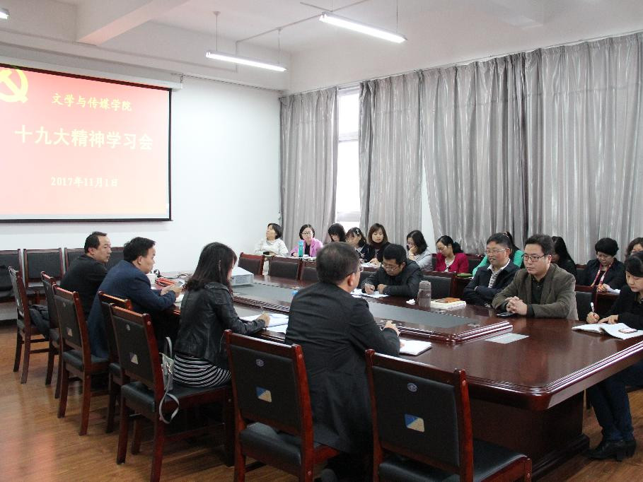 ——文传学院。10月18日上午9时,文传学院党总支组织党员教师和学生在2403教室集中收看党的十九大开幕式盛况,并于下午召开政治理论学习会议,传达习近平总书记的报告精神。会议由文传学院党总支书记于咏梅主持。于咏梅解读习近平十九大报告中出现的新思想和新精神,并要求所有老师要通过各种渠道和平台,认真学习会议讲话精神,并将其落实到具体的教育教学工作中。于咏梅强调,文传学院的各位教师尤其是党员教师要以饱满的精神状态、优良的工作作风和昂扬奋进的精神风貌做好教学和科研工作,把自己的思想认识和实际行动统一到报告精神上来,不忘初心,牢记使命,努力做党信任的教师和人民满意的灵魂工程师。文传学院院长戴承元谈道,十九大报告中提到“坚定文化自信,推动社会主义文化繁荣兴盛”,作为人文工作者,要深入学习报告内容,准确领会和深刻把握报告的丰富内涵,同时要用报告精神指导工作,把报告精神落实到文传学院的各项实际工作中去。10月22日下午,文传学院团总支、学生会在一号楼六楼报告厅召开本学期第二次学生干部例会,会议由团总支副书记、学生会主席田乃玉主持。会议伊始,全体起立齐唱团歌,田乃玉围绕“不忘初心,牢记使命”的主题对十九大报告进行了详细解读,她用习近平总书记在十九大上对青年学生的要求勉励大家:应尊师重教,学会创新,倡导创新文化,坚定理想信念,聚天下之英才,青年兴则国家兴!自觉做共产主义远大理想和中国特色社会主义共同理想的坚定信仰者和忠实实践者。10月28日晚,学院在江南校区大礼堂举行了“庆十九大 筑中国梦”迎新晚会。于咏梅代表领导班子为晚会致辞,并希望,全院学生要紧紧团结在以习近平同志为核心的党中央周围,“勇做时代的弄潮儿,在实现中国梦的生动实践中放飞青春梦想,在为人民利益的不懈奋斗中书写人生华章!”11月1日,学院党总支在陕南民间文化研究中心会议室组织教师学习十九大精神,会议由于咏梅主持,学院党总支宣传委员李景林主讲。李景林带领教师认真学习了十九大报告内容的第一至第五部分,与会教师在认真学习报告精神的同时,纷纷表示习近平总书记的报告传递出了新常态下的新动向,让人备受鼓舞,要以报告精神为引领,不忘初心,不负使命,立足本职岗位,积极投身新时代中国特色社会主义的伟大实践。学院副院长梁卫华,副院长、党总支纪检委员、教工第一党支部书记杨运庚,党总支组织委员、学生第一党支部书记邹棠华,学生第二党支部书记、团总支书记沈菲分别结合自身工作情况,谈了学习十九大报告的心得体会。