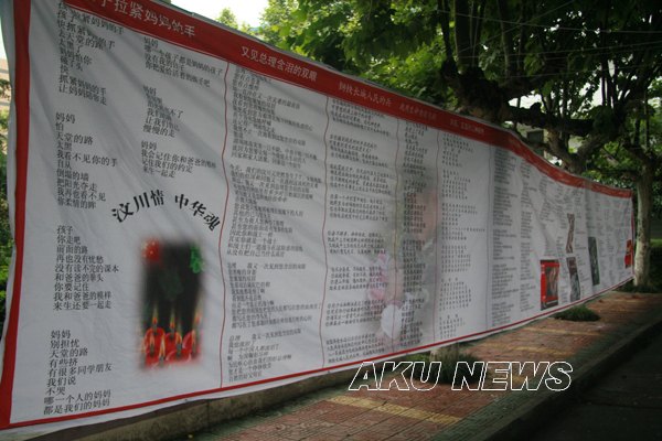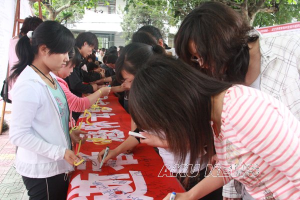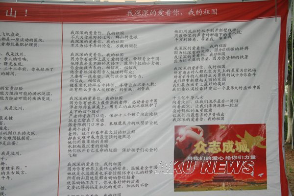 从5月12日早上起,由我院学生自发编辑的短信――“那一刻,我分明看见你哭了。5.12地震一周年,国人的哀思在心中流转,灾区人民需要我们支持。KY开元集团官网举行“黄丝带”签名送祝福活动,希望每一个收到短信的人都去参加,送去自己的祝福!”便在师生的手机上传播。12点下课后,大家自觉地来到了签名现场,默默地签下了自己的名字,系上黄丝带,为汶川祈福,为中国祈福。学院的外籍教师也来到现场,送上对灾区的祝福。 “黄丝带”在校园内穿梭,传递着希望,涌动着祝福。以“汶川情 中华魂”为题的诗歌条幅,吸引着众多师生驻足诵读,再次感受在灾难面前中华民族的不屈精神。