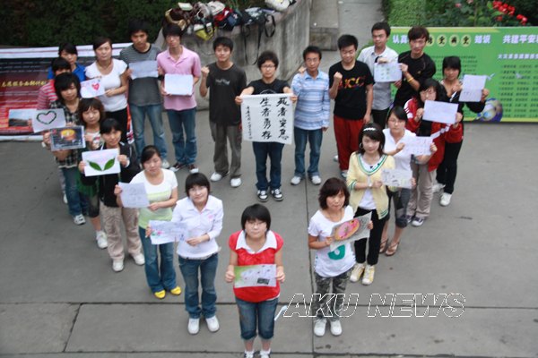 同时,艺术系08级设计专业的同学们,结合专业课程的教学类容,采用装置艺术的形式,以悬挂的一百把雨伞,寓意着天堂,表达真爱,人间有真爱,有真爱就有天堂;以三百六十五根蜡烛,代表着三百六十五个日日夜夜,表示着三百六十五天的牵挂,表达着三百六十五个祝福,祝愿在天堂的灵魂得到安息,祝愿人间真爱长存,祝愿汶川的明天依旧美丽。师生们校园中举行的各种活动也吸引了众多家属的参与。