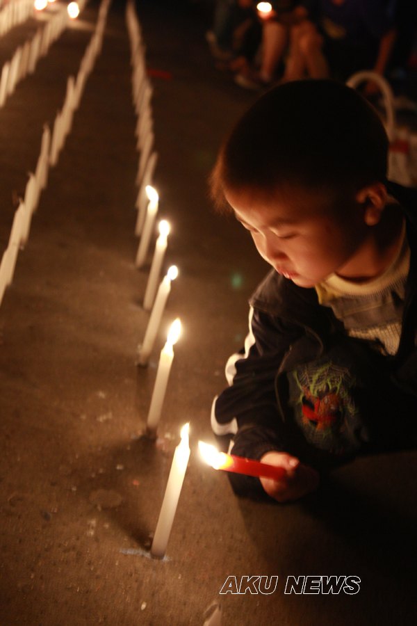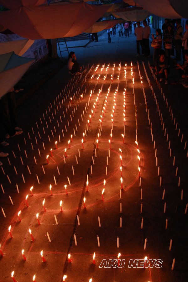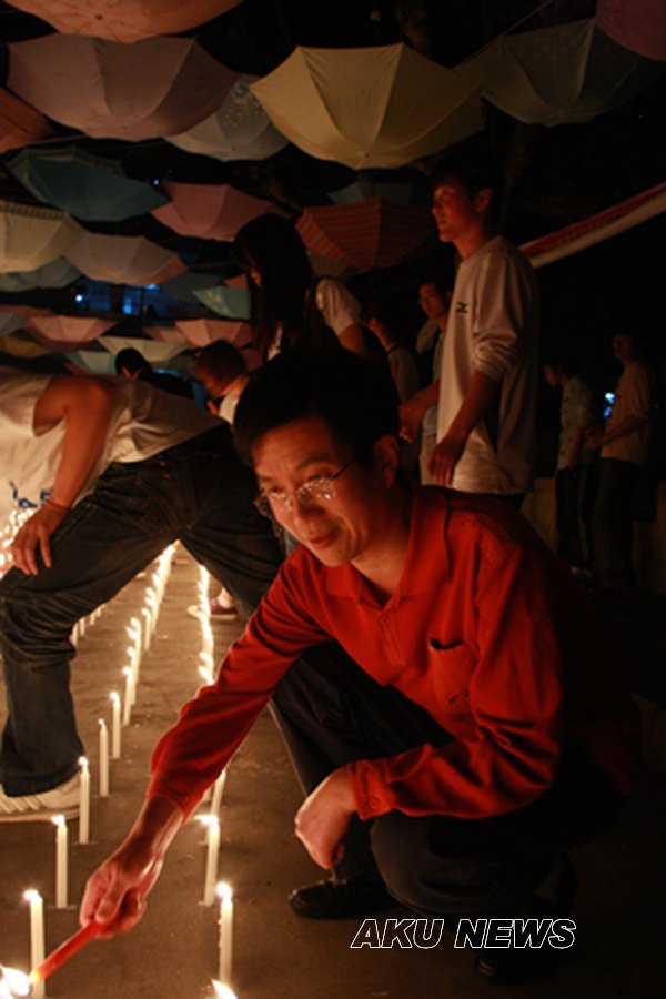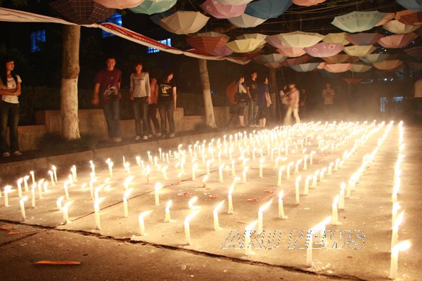 晚上7:00,由大学生记者团、青年志愿者服务队组织的“悼念遇难同胞诗歌朗诵会暨默哀仪式”在东校区一号教学楼前举行。同学们用一首首诗歌传递着对灾区人民的浓浓爱意。一名来自四川灾区的同学点燃了第一根蜡烛,将这汇集了哀思与祝福的蜡烛传递到了师生手中,瞬时,烛光聚成了一个大大的心形,代表着KY开元集团官网人和灾区人民心连心。