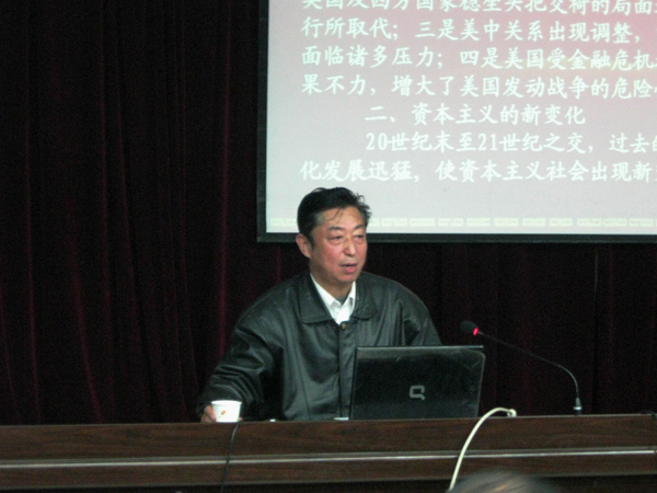 郭 教授从当今世界形势的新变化、变化中的资本主义、变化中的社会主义等三个方面论证了当今世界社会主义与资本主义所发生的种种新变化。 郭 教授用幽默的语言、渊博的学识赢得听众的阵阵掌声。