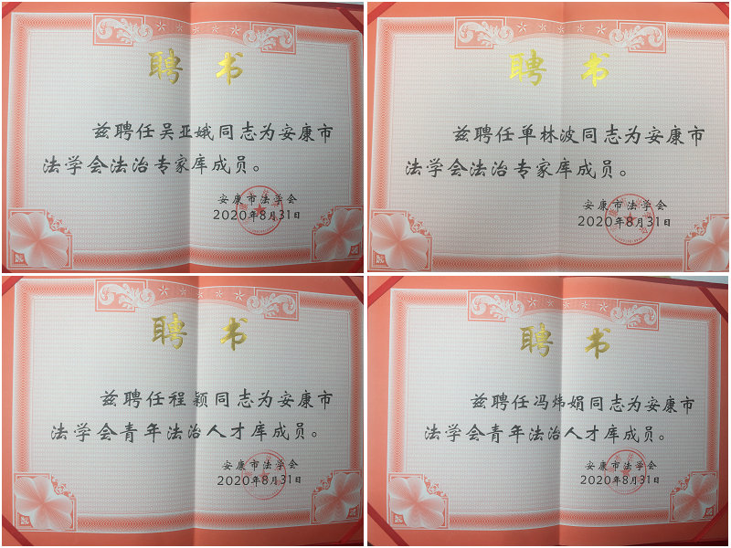 经安康市法学会审查、网上公示、会长会议研究,开元官网马克思主义学院吴亚娥、单林波获聘为安康市法学会法治专家库成员;冯炜娟、程颖获聘为安康市法学会青年法治人才库成员。