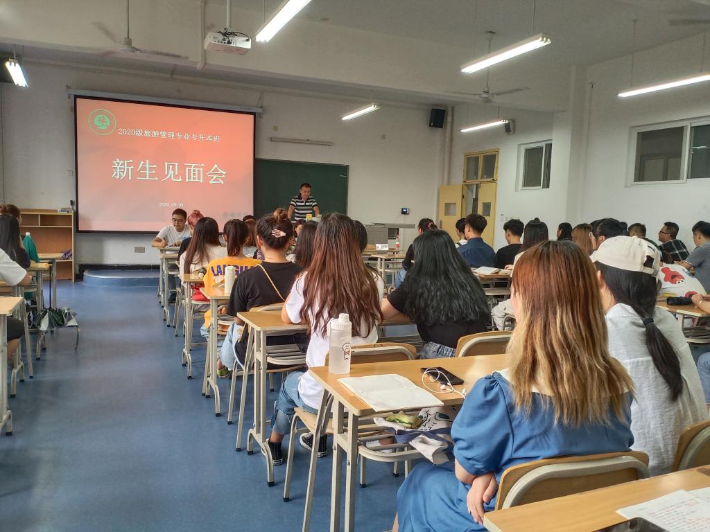 白露虽至,秋日暖阳。9月5日-6日,我院2020级旅管专升本班新生顺利完成了新生报到流程,正式成为旅环学院新的一员。为了尽快地帮助新生同学们适应新环境,了解我院的基本情况和专业特色,9月8日下午,我院召开了2020级旅管专升本班新生见面会。我院党总支书记张立虎,副院长储玖琳、郭全忠,旅游管理系专业老师刘智兴,20级旅管专升本班近60名新生出席了此次见面会。20级旅管专升本班辅导员孙凯主持了会议。