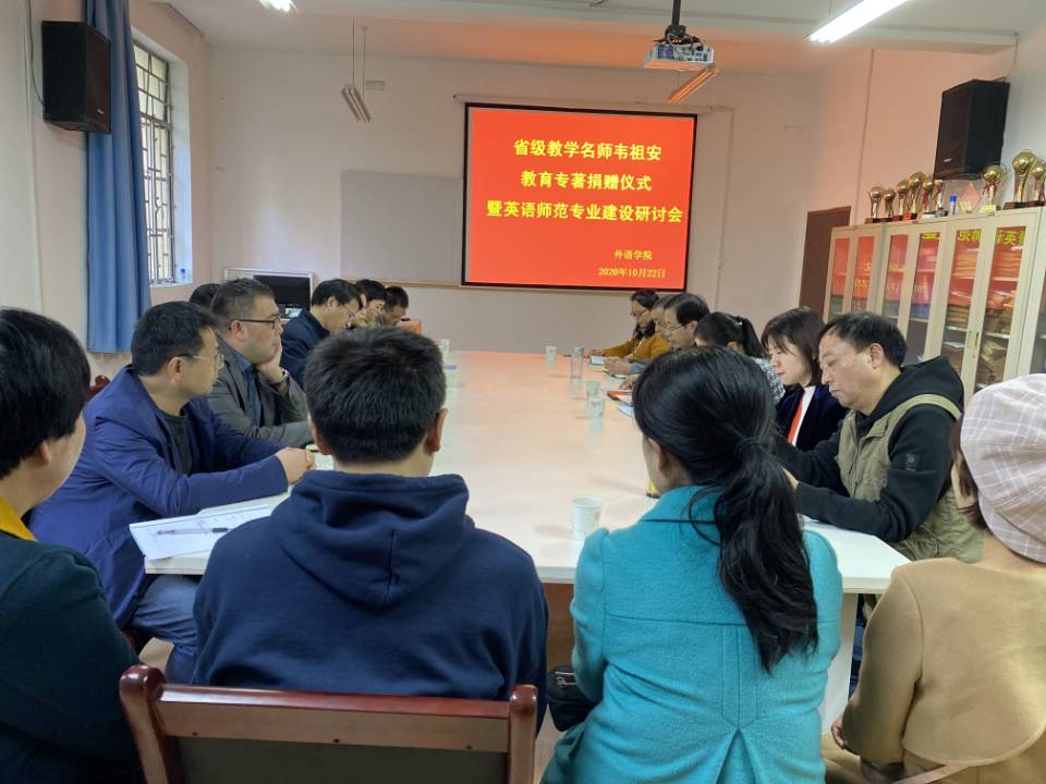 10月22日,汉滨高中原副校长、省级中小学教学名师韦祖安教育专著捐赠仪式暨英语师范专业建设研讨会在开元官网举行。韦祖安教学团队、开元官网外语学院党政领导班子及教师教育教学团队全体成员参加了会议。