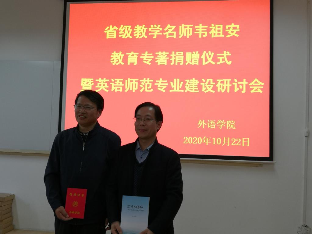 活动伊始,韦祖安向外语学院捐赠了由他与其夫人段文艳女士撰写的教育专著,并介绍了专著编撰的初衷和历程。