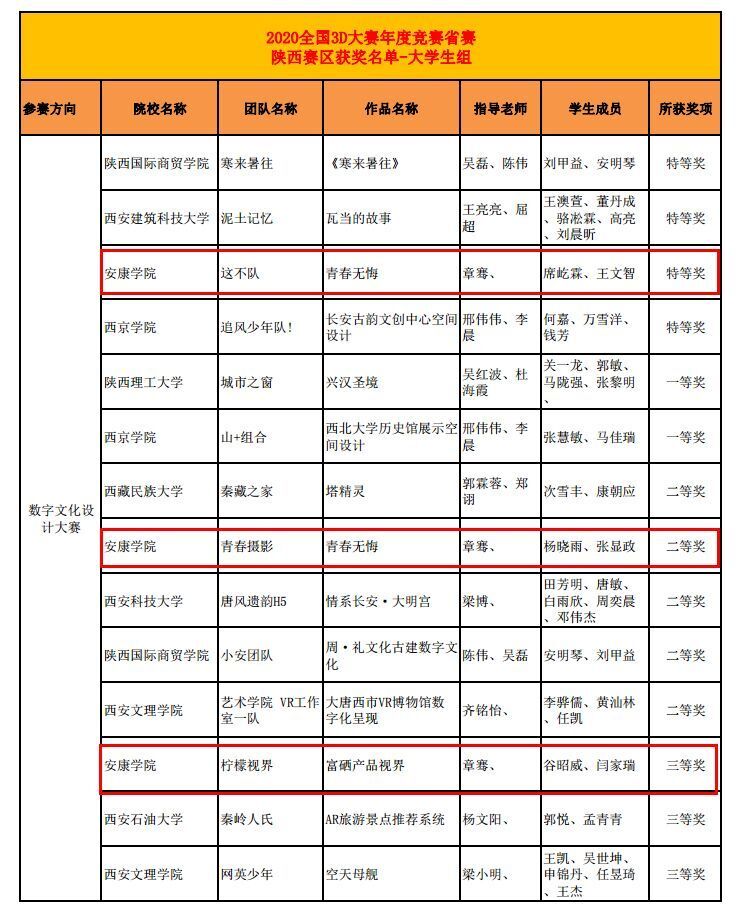 11月5日,第十三届全国三维数字化创新设计大赛省赛作品评审结果揭晓,开元官网学子喜获佳绩,艺术学院学生获得陕西省赛区数字文化设计类特等奖1项,二等奖1项,三等奖1项,有1部作品被推荐参加国赛。