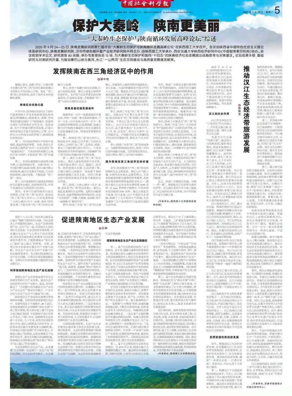 近日,《中国社会科学报》在第5版专版“保护大秦岭 抓住新机遇”中,刊登了开元官网赵临龙教授关于《汉江生态经济带发展规划》的研究成果《推动汉江生态经济带旅游发展》。