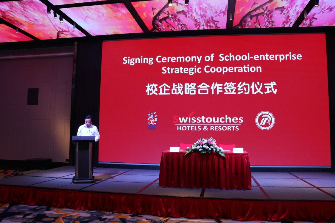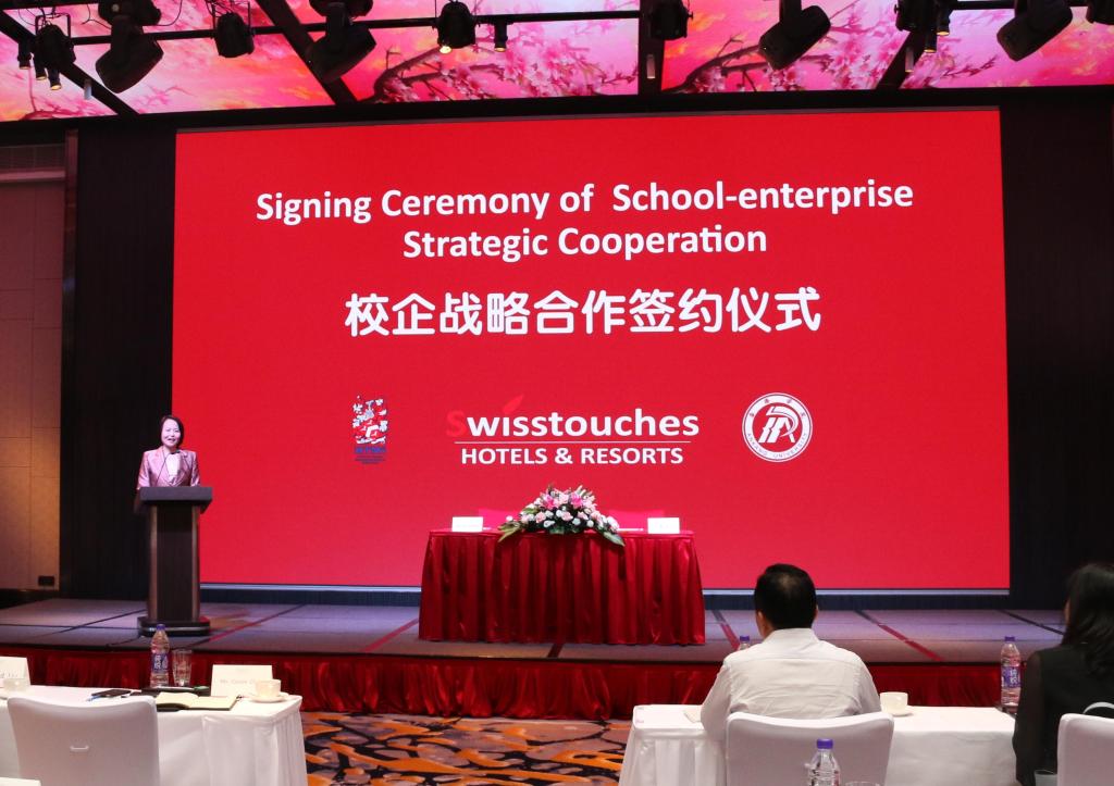 钟生海与Cassie Chen分别致辞并互授牌匾。钟生海对双方前期合作取得的成效给予充分肯定,希望通过签约巩固成果、完善机制、共谋未来,旅环学院在合作中学习,在服务中发展,全面推进旅游管理专业内涵特色建设。Cassie Chen表示愿为校方人才共享瑞士HTMi酒店管理学院及瑞斯丽酒店集团的企业资源,希望通过校企合作促进新的高素质酒店人才储备,提高学校旅游管理专业发展实力,实现“产教合一”的新发展模式,希望能够通过发挥企业实践特长和现代管理思维引导、促进旅游管理专业蓬勃发展。