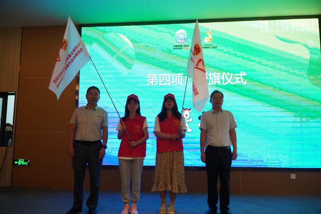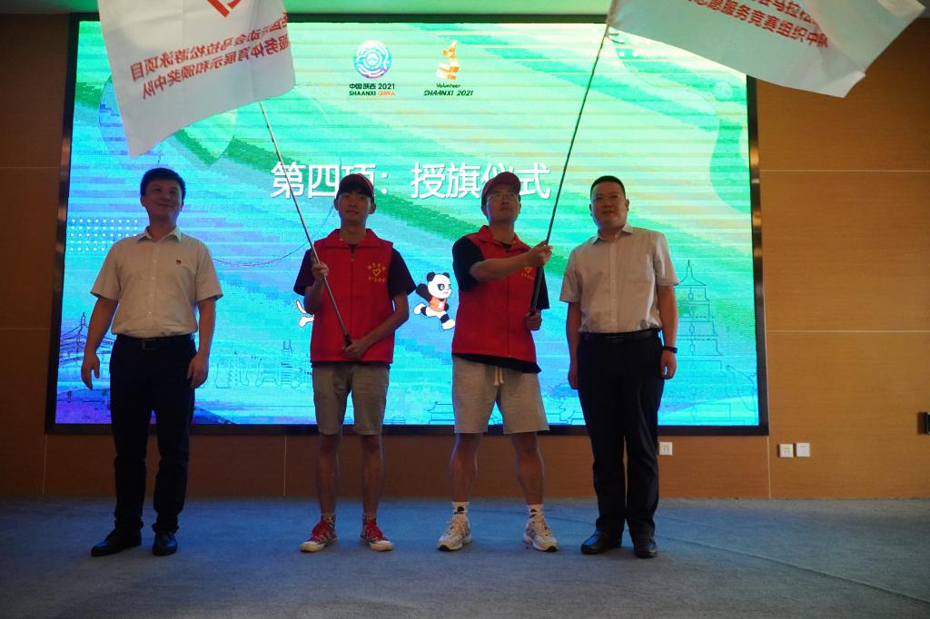 与会嘉宾分别为十四运会10公里马拉松游泳项目赛会各志愿队伍授旗。