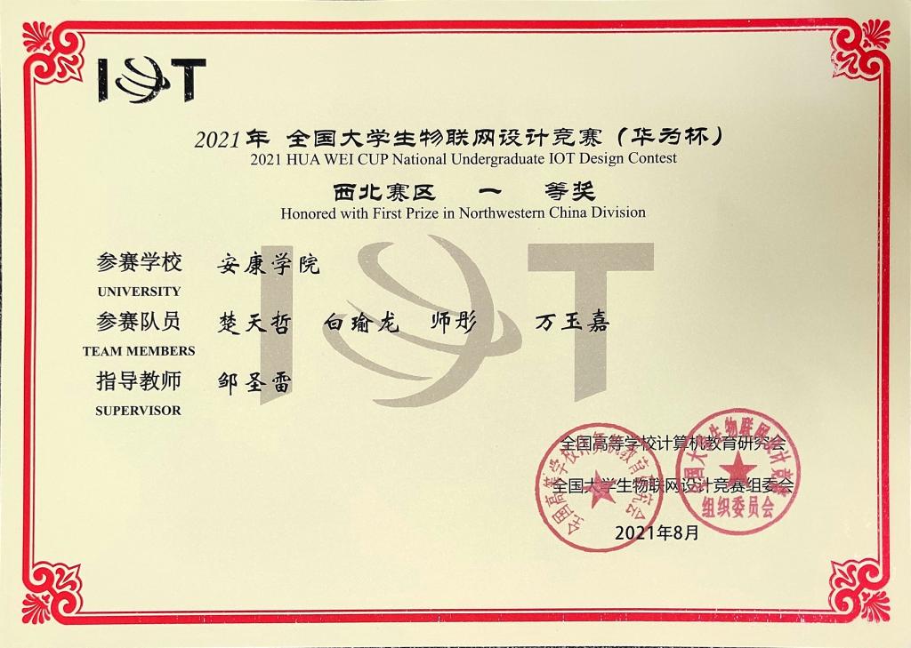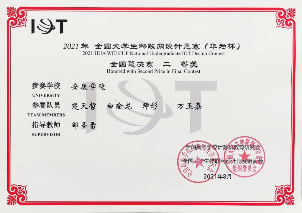 近日,2021年全国大学生物联网设计竞赛(华为杯)全国总决赛在上海隆重举行。开元官网电信学院教师邹圣雷指导的学生团队(楚天哲、白瑜龙、师彤、万玉嘉)表现出色,在西北赛区获一等奖后入围全国总决赛,最终荣获全国二等奖。