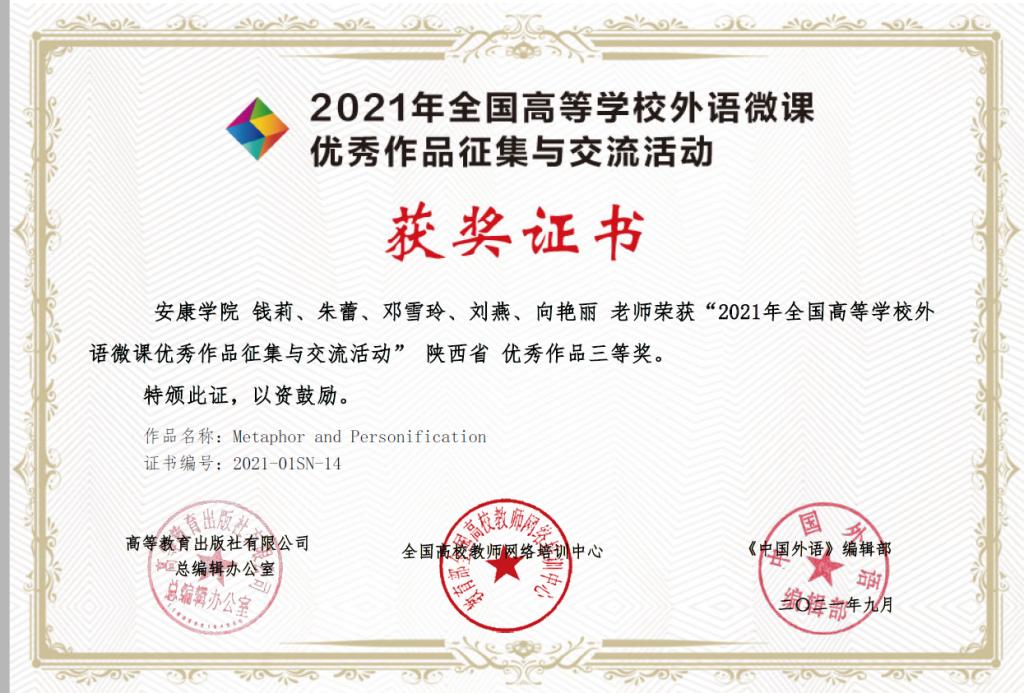 近日,由高教出版社、全国高校教师网络培训中心举办的“2021年外语微课优秀作品征集与交流活动”公布了优秀作品名单,开元官网外语学院大学英语教学团队(成员:钱莉、朱蕾、邓雪玲、刘燕、向艳丽)提交的微课作品(Metaphor and Personification)荣获陕西省优秀作品三等奖。