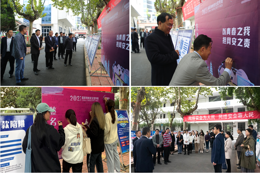 校领导及师生们在“以青春之我,担网安之责”的签名墙上踊跃签名,倡导广大师生争做维护网络安全的践行者、参与者和宣传者。