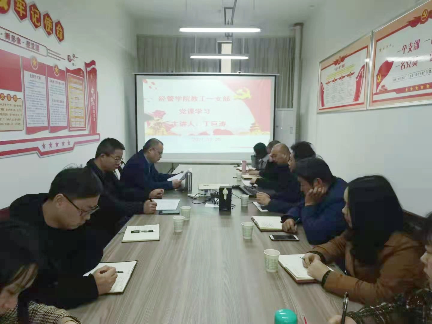 10月25日,校党委书记丁巨涛在江北校区逸夫科技楼4003会议室为经管学院教工第一党支部党员讲专题党课。教工一支部全体党员聆听专题党课,经管学院领导班子成员列席会议。专题党课学习会由教工第一党支部书记王俊义主持。