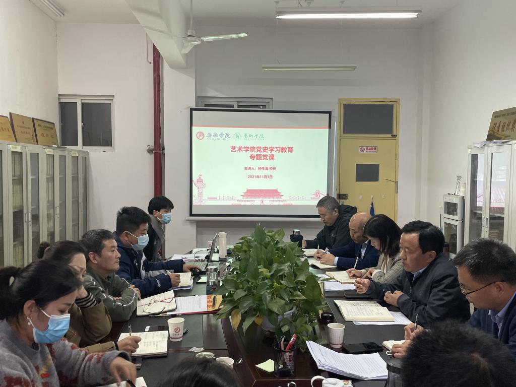 11月3日下午,校长钟生海受邀在江北校区2206会议室为艺术学院全体党员教师讲授党史学习教育专题党课。学院领导班子成员、教工党支部书记、党员教师三十余人参加学习。会议由艺术学院党总支书记黄娟主持。