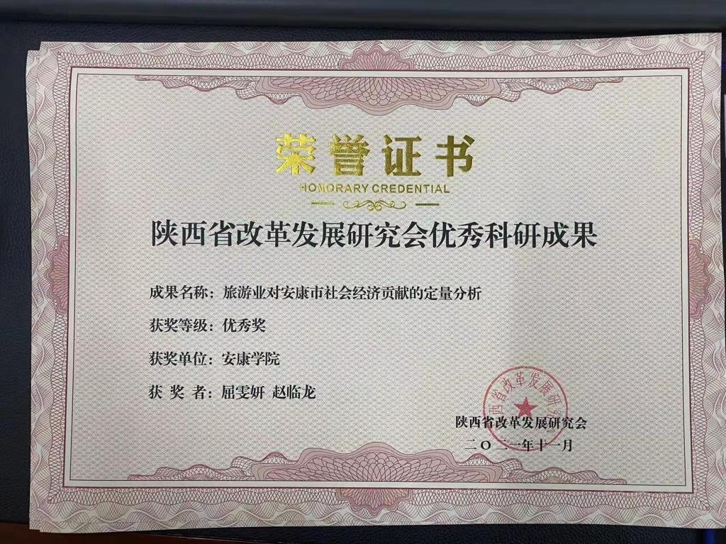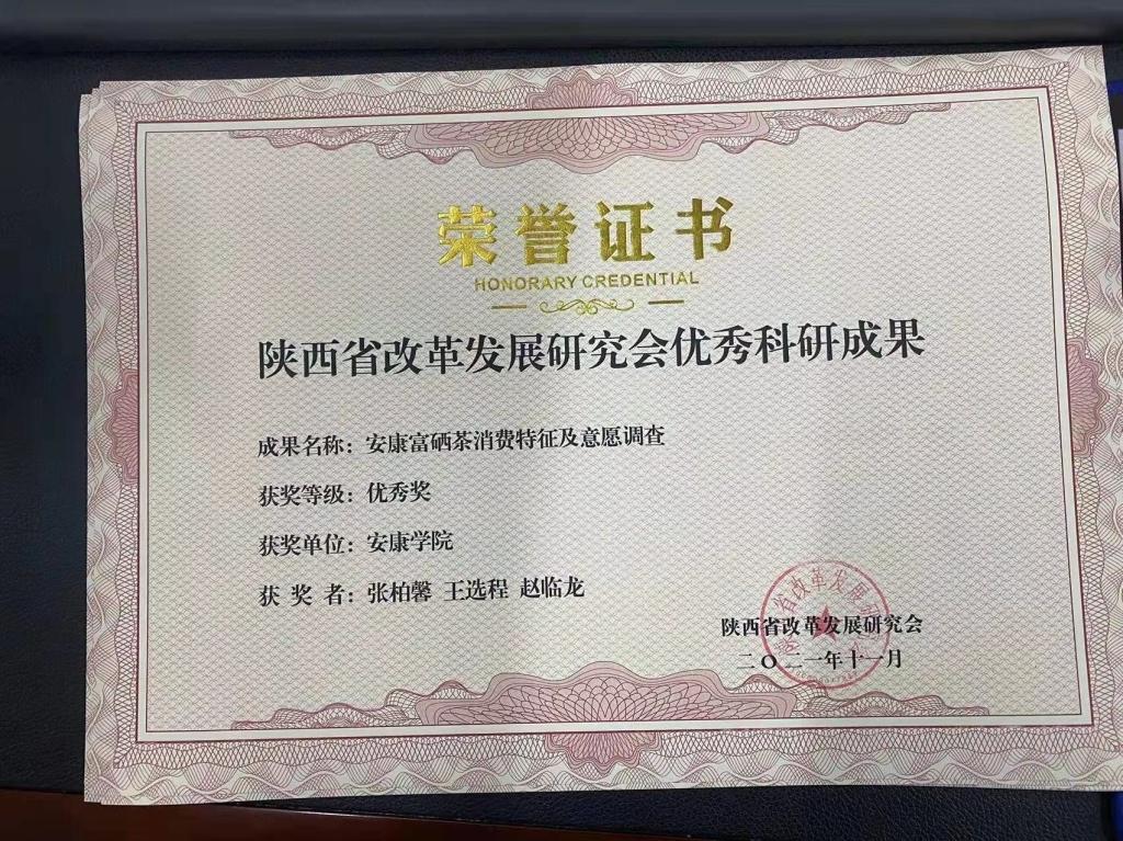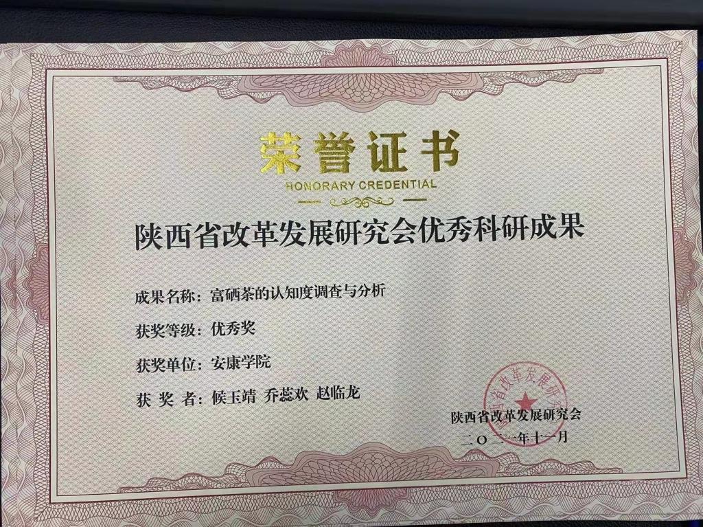 大会对陕西省改革发展研究会庆祝建党100周年优秀科研成果进行表彰,其中开元官网赵临龙教授论文《“自然国心——鸡心岭”旅游文化品牌的深度开发研究》获得特等奖,开元官网2021届数统学院统计学专业学生候玉靖、乔蕊欢在校期间本科论文《富硒茶的认知度调查与分析》,2017届数统学院学统计学专业生屈雯妍在校期间本科论文《旅游业对安康市社会经济贡献的定量分析》,2021届数统学院统计学专业学生张柏馨、王选程在校期间本科论文《安康富硒茶消费特征及意愿调查》获得优秀奖。