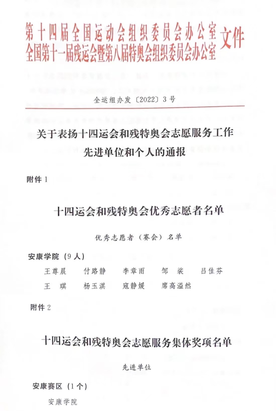 近日,第十四届全国运动会组织委员会办公室、全国第十一届残运会暨第八届特奥会组织委员会办公室联合发布了《关于表扬十四运会和残特奥会志愿服务工作先进单位和个人的通报》,KY开元集团官网获十四运会和残特奥会志愿服务先进单位荣誉称号,付路静等9名师生获十四运会和残特奥会优秀志愿者荣誉称号。