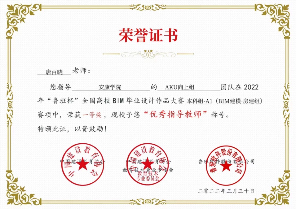 该项赛事由中国建设教育协会主办,中国建设教育协会教育技术专业委员会、浙江同济职业技术学院和上海鲁班软件股份有限公司共同承办,历时近5个月。比赛共分为赛项A(BIM建模)和赛项B(BIM应用)两个组别,本科组共有近300支团队1400余名师生参加比赛。开元官网经管学院教师唐百晓导学生团队“aku向上组”经过初赛、决赛、线上答辩和专家评审等环节在赛项A(BIM建模)赛项中获得全国一等奖,指导教师获得“优秀指导老师”称号。