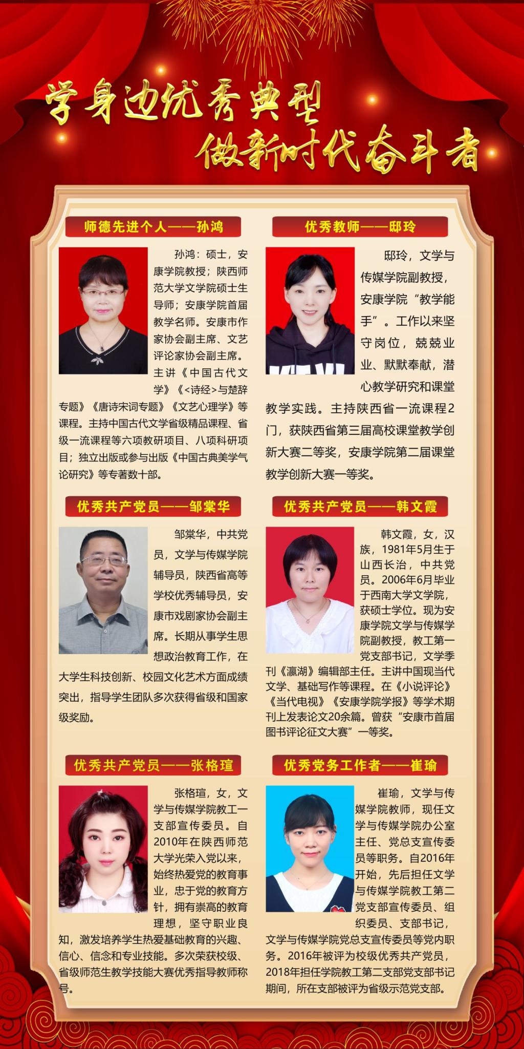 围绕典型示范抓创建,推动学院改革发展到位。开展“学身边优秀典型、做新时代奋斗者”表彰活动,引导广大党员、教师向先进榜样学习,向先进榜样看齐,营造百花齐放、追赶超越的良好氛围。教师党员先锋模范作用进一步发挥,在国一流专业申报、师范专业认证工作中冲锋在前,涌现出了“陕西省教学名师”、“陕西高校本科教学管理工作先进个人”、第四届陕西本科高校课堂教学创新大赛三等奖、“师德先进个人”“优秀教师”“优秀共产党员”“优秀党务工作者”“道德家庭”模范等一批先进典型,并获批了“省级新文科研究与实践项目”“线下一流课程”“线上一流课程”“陕西省高等教育教学成果奖”等一批标志性项目和奖项。学生分会被评为优秀学生分会、团总支荣获“KY开元集团官网五四红旗团总支”荣誉称号,3个班团支部获“KY开元集团官网五四红旗团支部”称号,2个班集体获评校级文明班级。1名学生荣获年度陕西省学联学生会先进工作个人,1名学生获2020年度“陕西省大学生自强之星”和“中国大学生自强之星”、第十六届“全国大学生年度人物”(入围奖)。学院党总支荣获2021年“两优一先”表彰“先进基层党组织”称号。学院荣获2021年度学校目标责任考核优秀单位。
