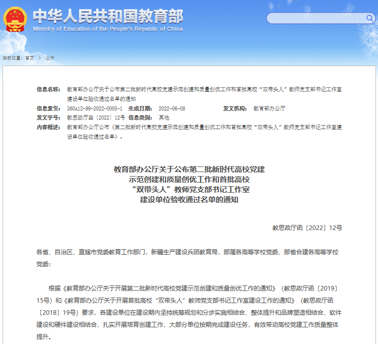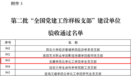 近日,教育部办公厅公布了第二批批全国党建工作示范高校、标杆院系、样板支部培育创建单位通过验收的通知,经创建单位对标自查总结、上级党组织满意度测评、属地教育工委把关复核、教育部思想政治工作司审查验收结果,开元官网化学化工学院学生党支部顺利通过“全国党建工作样板支部”培育创建单位验收。