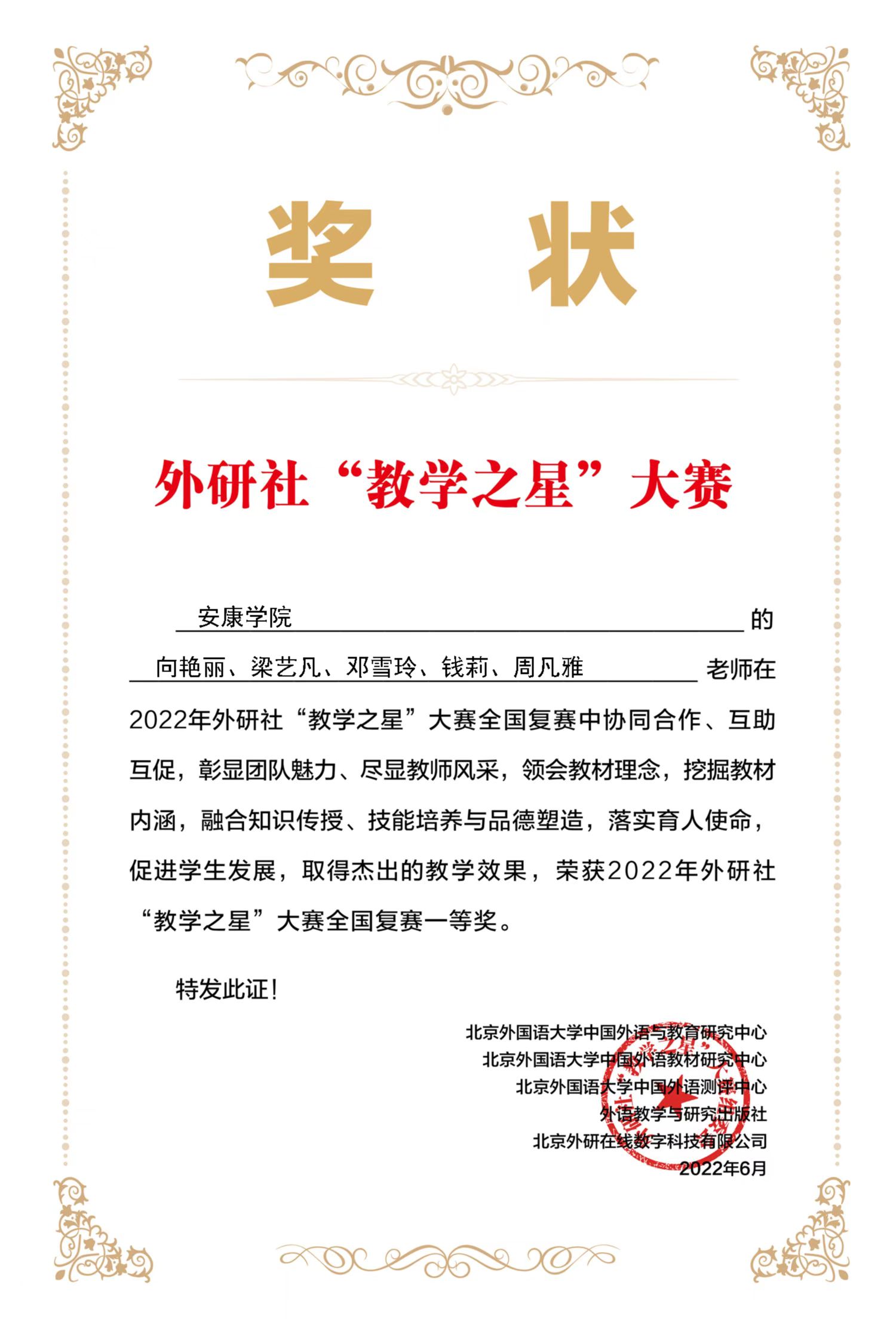 近日,2022年外研社“教学之星”大赛全国复赛结果揭晓。开元官网外语学院推荐的两个教学团队在全国各高校共计569份参赛作品中脱颖而出:由副院长胡卫卫作为团队负责人的专业教师教学团队(成员:周玫、王欢、姜国波、彭方圆)和向艳丽副教授带领的大学英语教学团队(成员:梁艺凡、邓雪玲、钱莉、周凡雅)分别荣获英语专业组全国复赛一等奖和大学英语组全国复赛一等奖的好成绩。