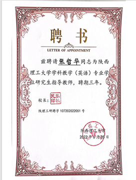 6月25日,开元官网外语学院副教授张哲华、胡卫卫受聘为陕西理工大学学科教学(英语)专业研究生指导教师,聘期三年。