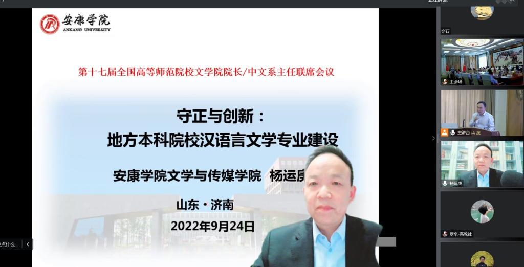 9月24-25日,第十七届全国高等师范院校文学院院长/中文系主任联席会议在山东师范大学召开,会议通过线上线下结合的方式举行,全国80余所师范院校的150余名文学院院长、中文系主任参加了会议。开元官网文学与传媒学院院长杨运庚教授以线上的方式参加了会议并做了大会报告。