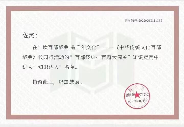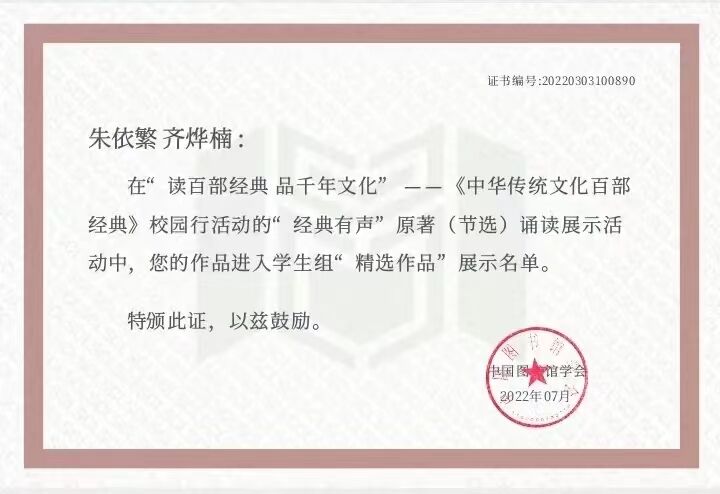 近日,由国家图书馆、中国图书馆学会主办的“读百部经典 品千年文化”《中华传统文化百部经典》校园行活动评选揭晓,开元官网外语学院佐灵等234名同学荣获“知识达人”称号,教育学院朱依繁、齐烨楠的诵读作品《离骚》等72个诵读作品被评为“精选作品”并在全国范围内展播;开元官网图书馆荣获“组织得力图书馆”奖项,在全国1331所参赛高校中排名第22位,是陕西省唯一进入全国排名前30位的高校。