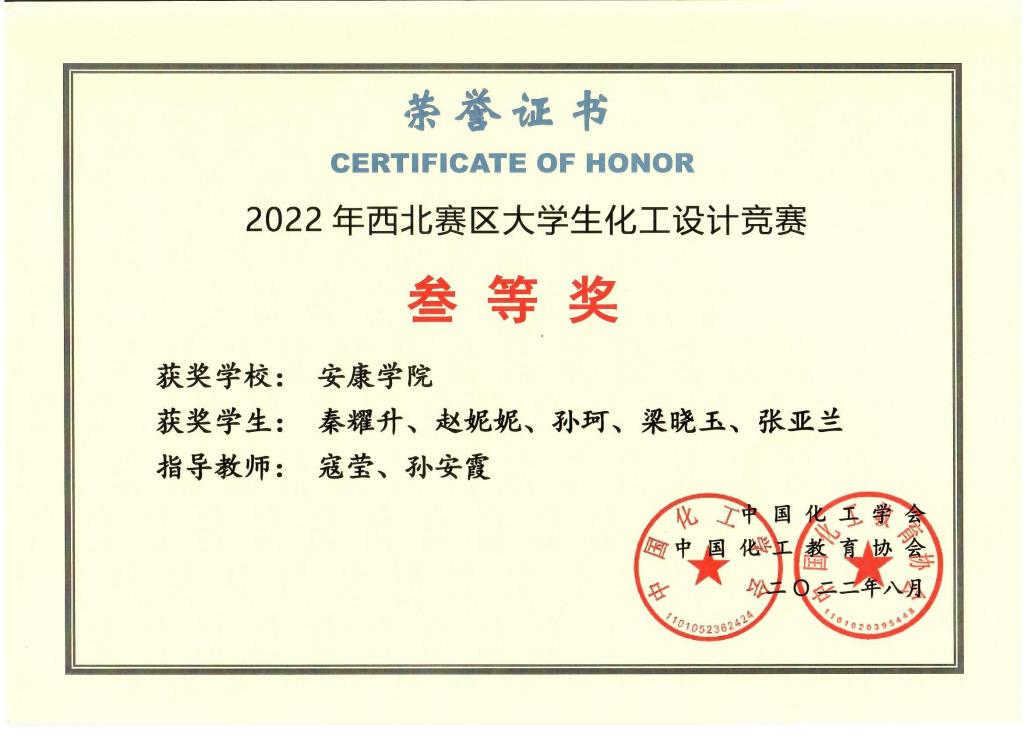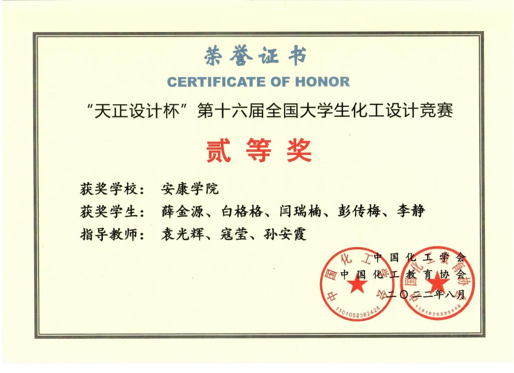 近日,“天正设计杯”第十六届全国大学生化工设计竞赛西北赛区和全国总决赛结果公布,开元官网化学化工学院化学工程与工艺专业2019级学生薛金源、白格格、闫瑞楠、彭传梅、李静组成的“X队”荣获全国二等奖,秦耀升、赵妮妮、孙珂、梁晓玉、张亚兰组成的“醇醇爱住我们队”荣获西北赛区三等奖。