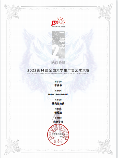 近日,第十四届全国大学生广告艺术大赛陕西赛区比赛结果公布,开元官网艺术学院学生再获佳绩,获得一等奖1项、二等奖5项、三等奖5项。