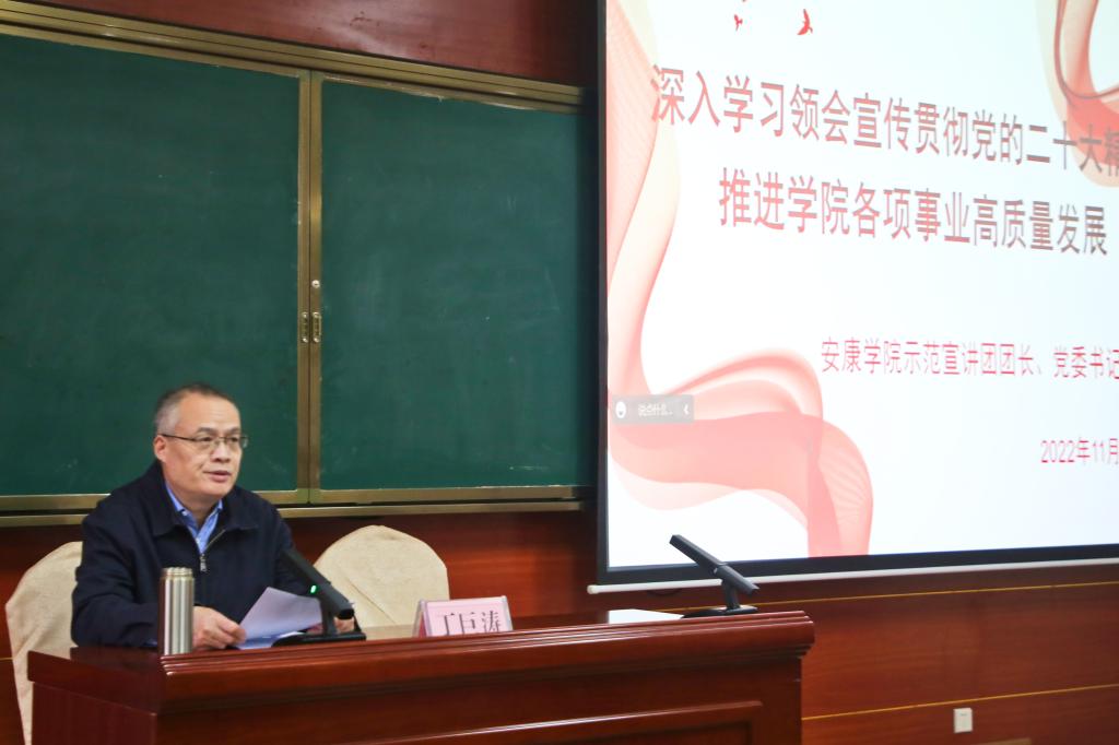 党委书记丁巨涛就做好党的二十大精神宣讲工作做了要求讲话。一是要精心准备,学深学透,深刻领悟报告的精神要旨,将宣讲作为光荣使命和重大责任。宣讲团成员要全面学习把握二十大精神,扎实细致做好宣讲准备工作,做到学先一步、学深一步,坚持把政治引领贯穿宣讲全过程,在学深悟透、融会贯通,把握实质、精准解读,联系实际、创新方法上下功夫,让师生被真理的力量所感召,被自信自强、守正创新的态度所激励,被踔厉奋发、勇毅前行的精神所感染,凝聚起万众一心、攻坚克难的磅礴力量。二是要精准宣讲,紧扣报告,结合学校工作实际,全面准确、深刻生动的完成宣讲任务。党的二十大精神宣讲是一项政治性高、学理性强、饱含政治情感的政治任务,宣讲团的同志们要紧紧围绕“三个全面”“五个牢牢把握”“九个深刻领会”“七个聚焦”等重要要求,全面准确深入宣讲党的二十大精神,讲清楚党的二十大的主题,讲清楚过去5年的工作和新时代10年的伟大变革,讲清楚开辟马克思主义中国化时代化新境界,讲清楚以中国式现代化全面推进中华民族伟大复兴,讲清楚对党和国家事业的新部署新要求,讲清楚加强党的全面领导、坚定不移推进全面从严治党的部署和要求,讲清楚以顽强斗争应对风险挑战的要求,帮助广大师生不断加深对党的二十大精神的理解和把握。三是要精细育人,凝心聚力铸魂,做好二十大精神“落地生根”。要结合不同宣讲对象,细化宣讲方案,入脑入心,让全校师生深刻把握“教育是国之大计、党之大计”这一重大使命,“立德树人”这一根本任务,“坚持以人民为中心发展教育”这一价值追求,“加快建设高质量教育体系”这一重要部署,强化政治引领,引导全校师生坚定理想信念,锤炼过硬本领,扛牢时代使命,激扬奋斗精神,立足岗位、立足自身,坚持问题导向、目标导向、需求导向,把党的二十大精神落实体现到做好今年各项工作和安排好今后工作之中。