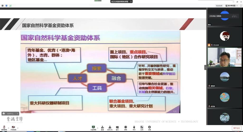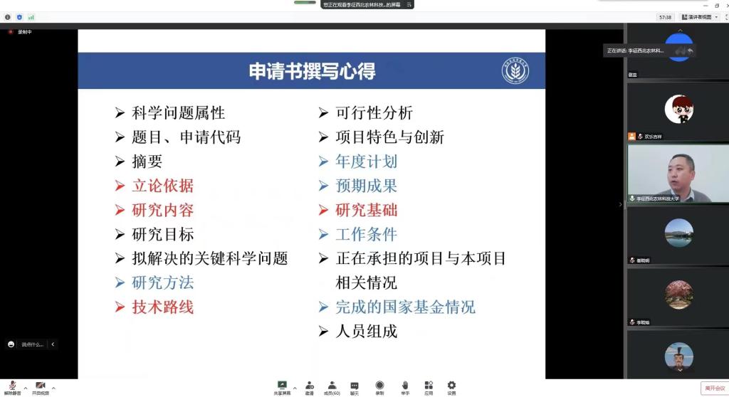 在疫情防控期间,科研处积极响应学校疫情防控的要求,在暂停线下会议和学术活动的同时,全面开启“云科研”模式,于11月29日—30日连续举办了两场“2023年度国家自然科学基金项目申报线上辅导会”。会议邀请了西北农林科技大学李征教授及陕西科技大学李国梁教授就国家自然基金项目申请书撰写等内容作了辅导交流。科研处处长崔晓明、相关二级学院分管科研工作院长、开元官网120余名教师线上参加会议,科研处副处长黎欢吉主持会议。