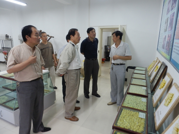 弋辉一行参观了蚕桑重点实验室展室,详细询问和了解了实验室的基本情况、天然彩色茧产业化开发及副产品开发等情况。