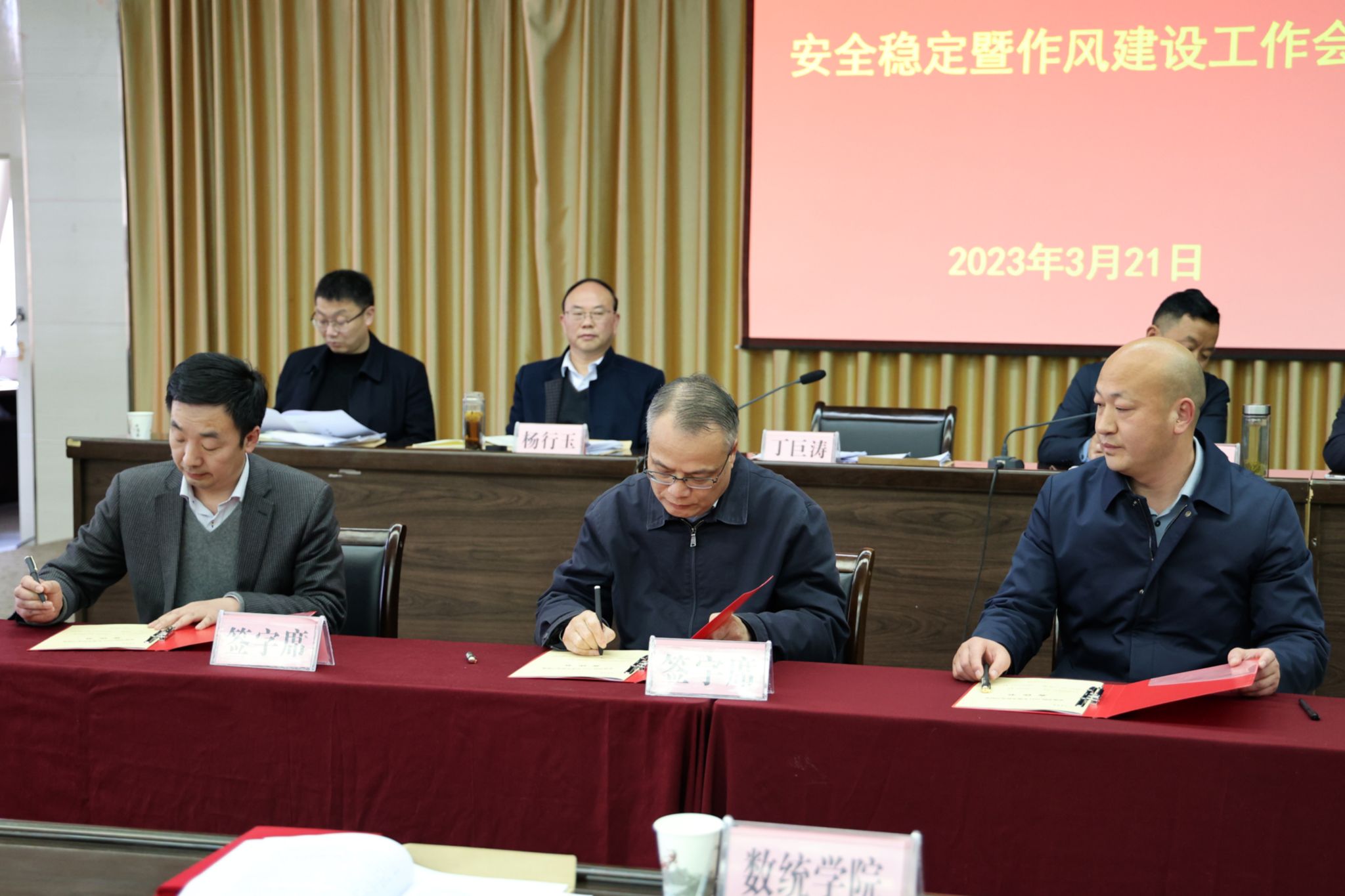 丁巨涛、钟生海分别代表学校党委和行政,与二级学院和职能部门代表签订《2023年全面从严治党工作责任书》和《2023年安全稳定工作责任书》。