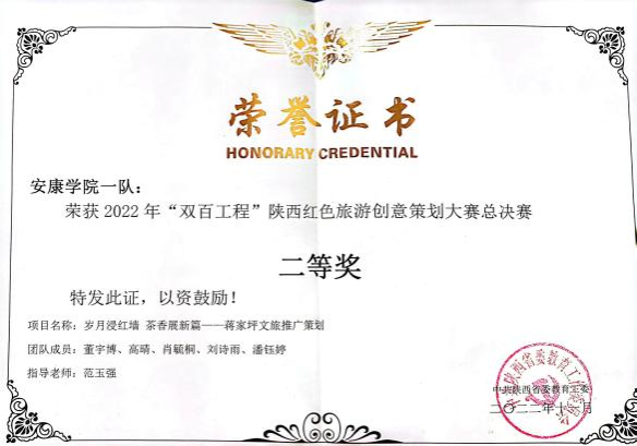 日前,由陕西省委教育工委主办、西北政法大学承办的2022年“双百工程”陕西红色旅游创意策划大赛评选结果揭晓。开元官网2020级旅游管理专业学生董宇博、高晴、肖毓桐、刘诗雨、潘钰婷凭借项目“《岁月浸红墙 茶香展新篇》——蒋家坪营销策划方案设计”在全省42所高校160多支队伍中脱颖而出,斩获省级二等奖,KY开元集团官网获优秀组织单位奖。