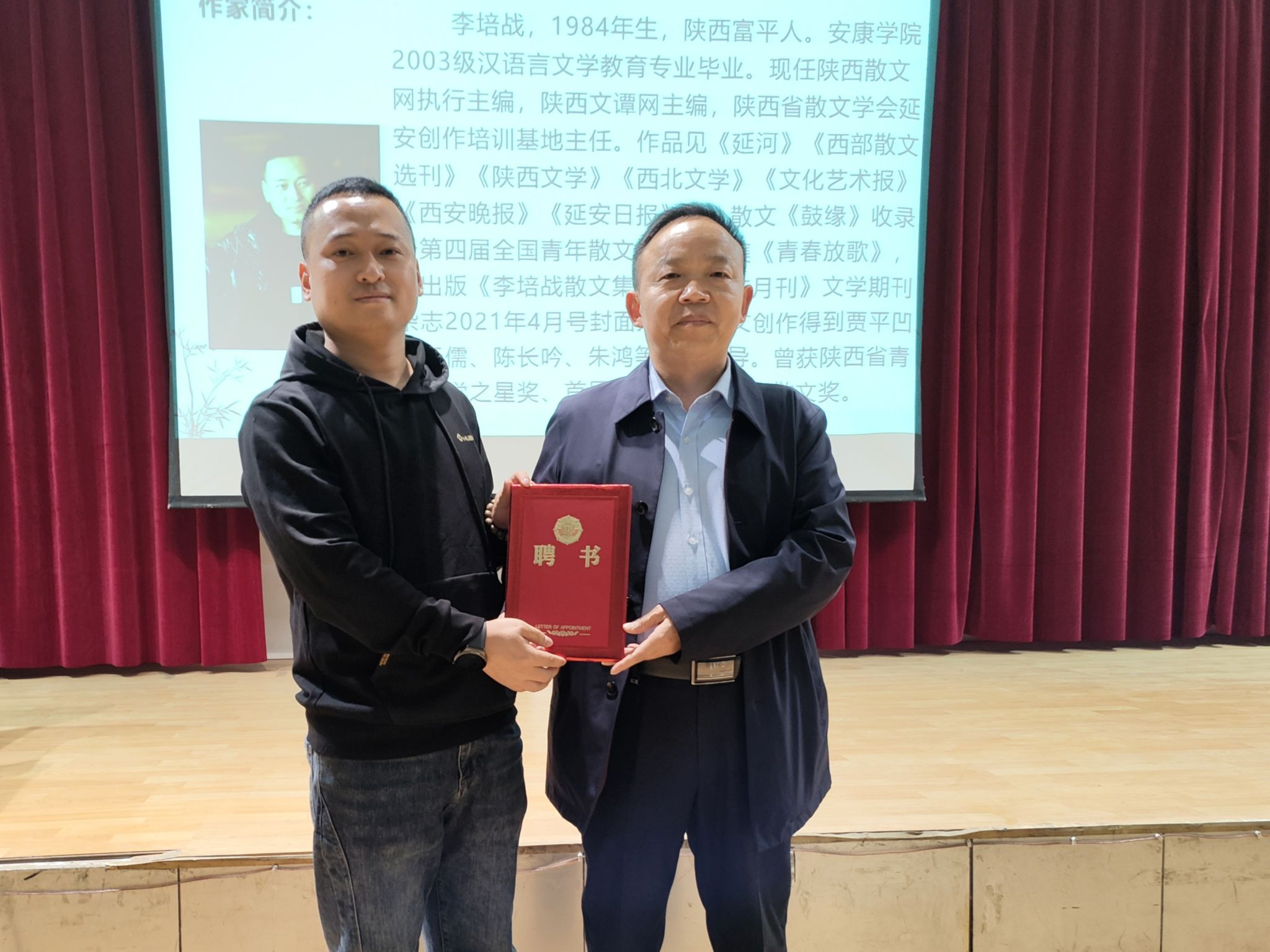为充分发挥校友榜样力量,聚合校友资源强化育人,4月12日下午,文学与传媒学院邀请汉语言文学专业2006届校友、现任陕西散文网执行主编、陕西文谭网主编、陕西省散文学会延安创作培训基地主任李培战在一号教学楼六楼报告厅举办文学创作报告会。文传学院院长杨运庚、党总支副书记杨海蓉、辅导员邹棠华,影视戏剧社、文学创作社、风华诗社共计二百余人到场聆听。本次报告会由杨海蓉主持。
