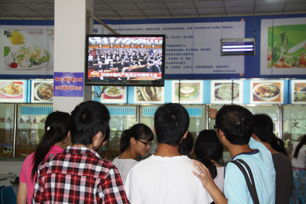 学院领导、各职能部门负责人在第一会议室收看了大会直播。各院系组织教师、学生在办公室收看了现场直播。部分学生还在餐厅观看了直播。