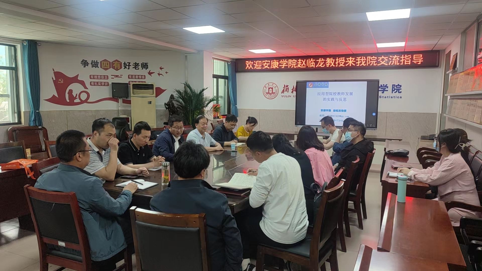 在榆林学院校区,赵临龙为数学与统计学院教师作了《应用型院校教师发展的实践与反思》的报告,报告从教师回归教学、推动一流课程建设以及教师转型服务地方社会两方面介绍教师转型工作中的实践和反思。