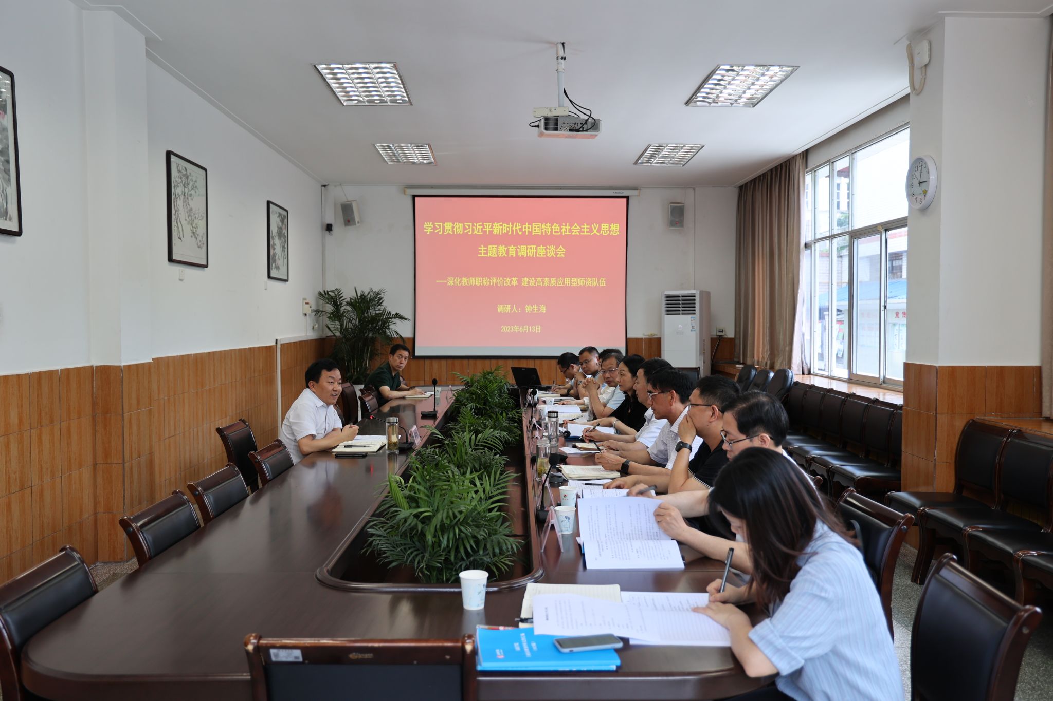 6月13日下午,校长钟生海主持召开了“深化教师职称评价改革建设高素质应用型师资队伍”专题调研座谈会,人事处、科研处、教务处、学工部,化工学院、马克思主义学院、外语学院、艺术学院等单位负责人参加了调研。省委主题教育第十三巡回指导组进行旁听指导。