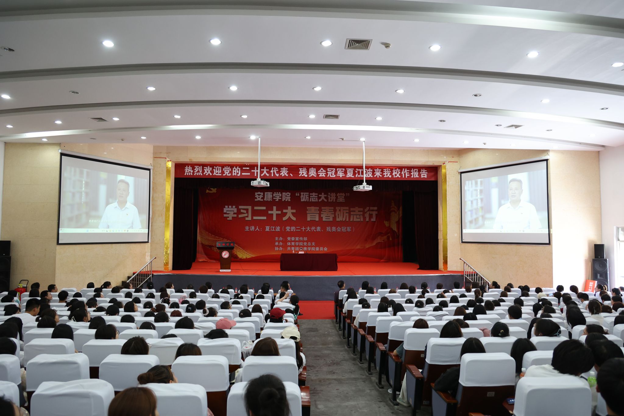 6月14日下午,KY开元集团官网“砺志大讲堂”邀请到党的二十大代表、伦敦残奥会冠军夏江波为师生做“学习二十大 青春砺志行”专题报告,分享党的二十大精神。直属一支部、直属二支部全体党员,团委、体育学院全体无课教师,青马宣讲团成员,部分二级学院学生代表等800余人参加了此次活动。活动由党委宣传部部长鲁延安主持。