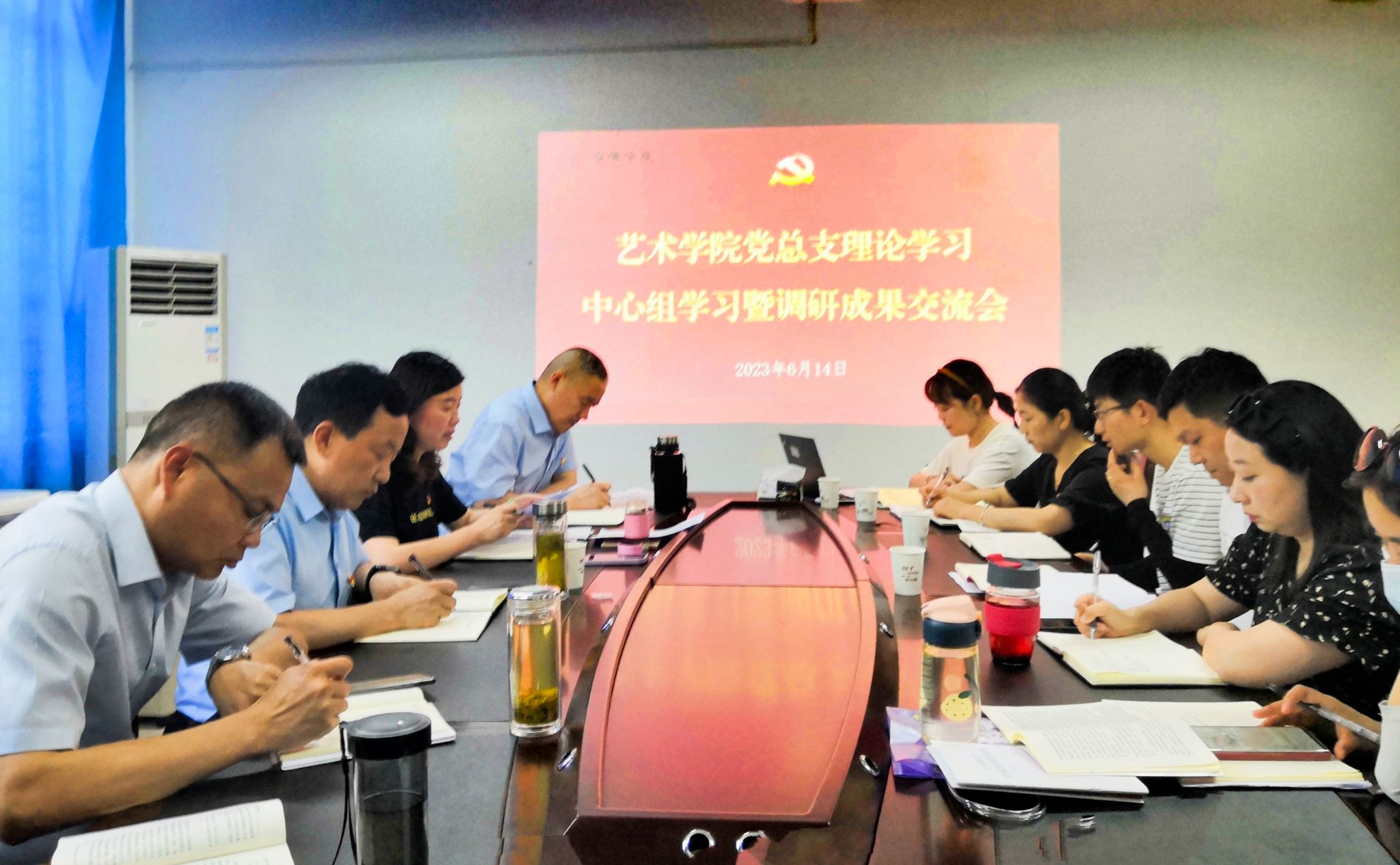 6月14日,艺术学院党总支在江南校区召开理论学习中心组(扩大)学习会暨主题教育调研成果交流会。校长钟生海旁听指导本次政治理论学习。艺术学院班子成员、总支委员、各支部书记及支委、系主任、辅导员参加了会议。
