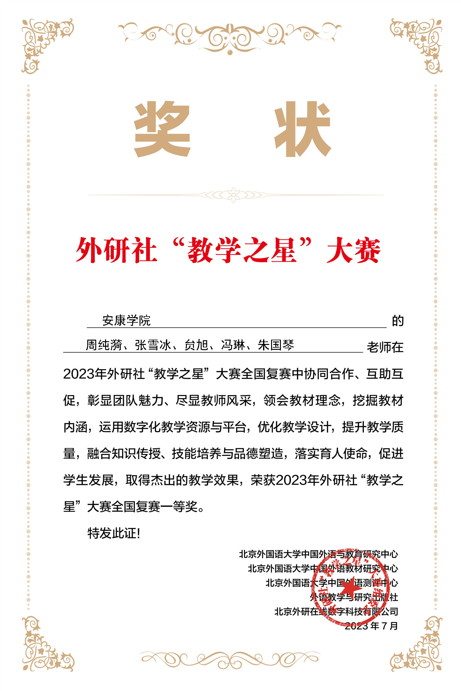 附:外研社“教学之星”大赛是由教育部高等学校大学外语教学指导委员会、教育部高等学校英语专业教学指导分委员会、外语教学与研究出版社、北京外研在线教育科技有限公司共同主办的面向全国高等学校外语教师的大型赛事,在全国高校外语教育领域广受认可,被列入2022版全国普通高校教师教学发展指数来源。